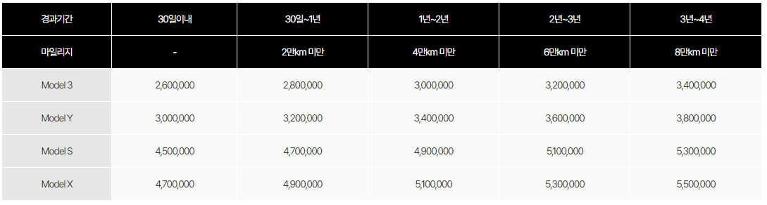 신차 구매시 제공되는 '기본 차량 제한 보증'과 동일한 기준으로 적용하며, 테슬라 공식 부품으로 교체 또는 수리 서비스를 받으실수 있습니다 (타이어를 포함한 소모품, 견인서비스는 제외)